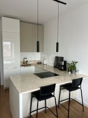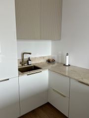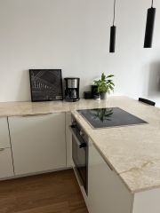 Кухонный гарнитур: столешница натуральный мрамор, встроенный духовой шкаф и посудомоечная машина.