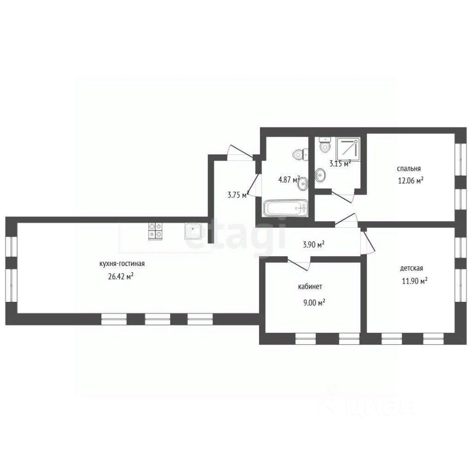 Функциональная планировка с тремя изолированными комнатами, двумя санузлами один из которых находится в мастер- спальне и большой кухней гостиной.