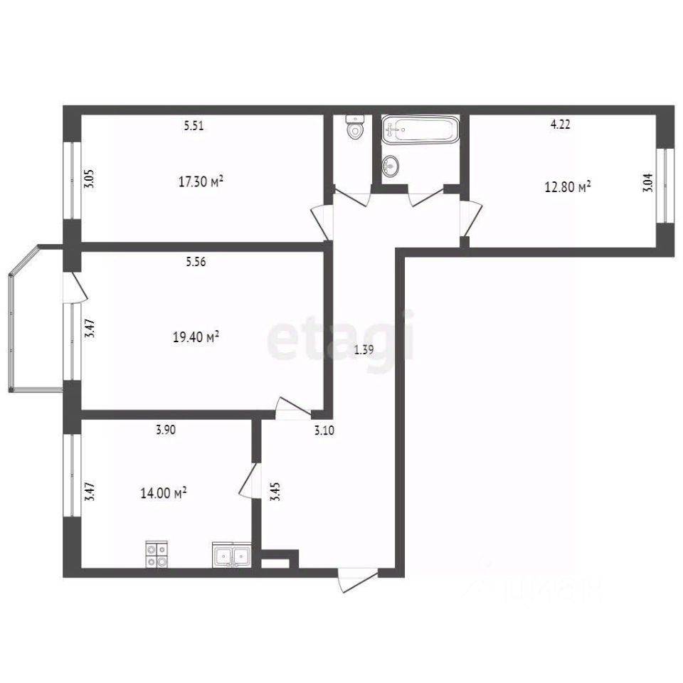 В квартире 3 просторные раздельные комнаты площадью 19,4/17,3 и 12,8 м2, а т.ж. больше кухня размером 14 м2.