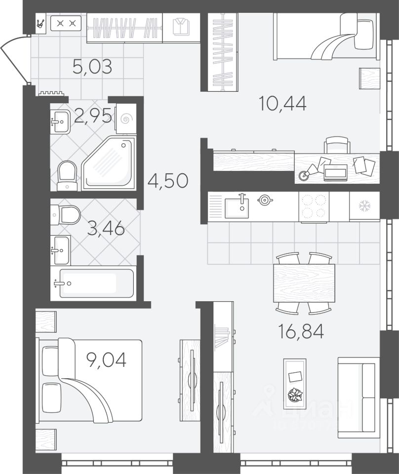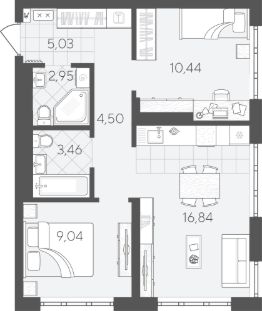 Квартира с 2 спальнями площадью 52,26 кв.м