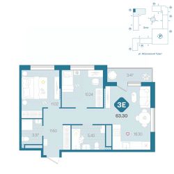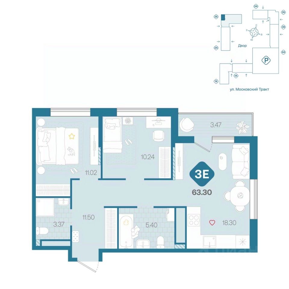Просторная трешка с окнами на две стороны. В квартире просторная прихожая с нищами под вместительные шкафы для хранения. Две светлых спальни. Гостиная площадью более 20 м² с выходом на балкон, нишей для приготовления, обеденной и гостиной зонами.