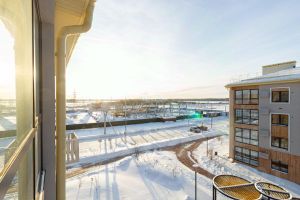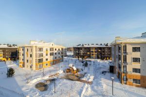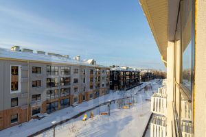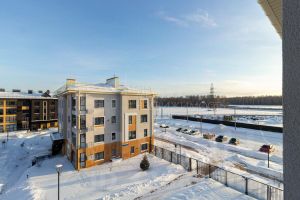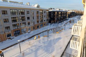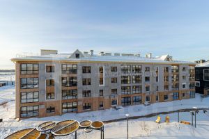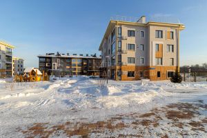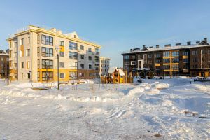Малоэтажное строение жилого комплекса и простор вокруг создают впечатление загородной жизни в пригородном формате.