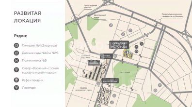 Напротив дома - гимназия, сквер Вьюжный и скейт-парк. Рядом лесопарк, в котором можно отдохнуть от городского шума.