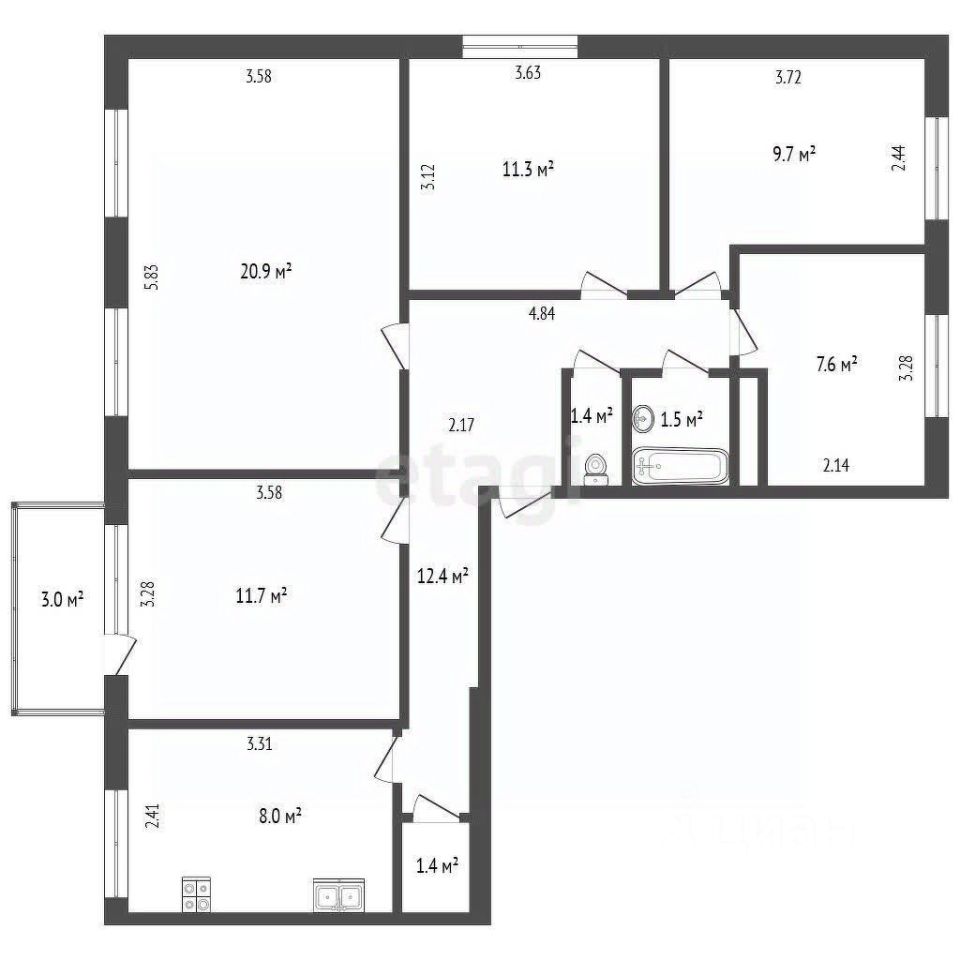 Все комнаты изолированные, кухня 8 кв.м, санузел раздельный, есть гардеробная и балкон. Стены не несущие, возможно перепланировать в 3+ или 4-к.