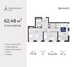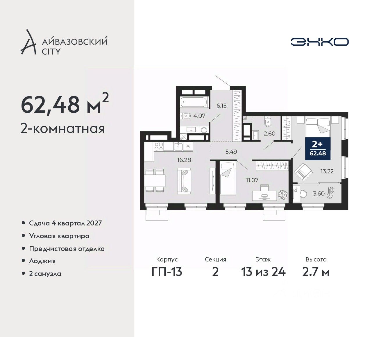 Двухкомнатная квартира с предчистовой отделкой в ЖК "Айвазовский City" на 13 этаже. Общая площадь: 62.48 кв.м., жилая: 24.29 кв.м., площадь просторной кухни-столовой: 16.28 кв.м. Угловая квартира, окна oбecпeчивaют paвнoмepнoe ocвeщeниe в тeчeниe дня. В квартире одна лоджия, один совмещенный и один раздельный санузел. Высота потолков 2.7 м.