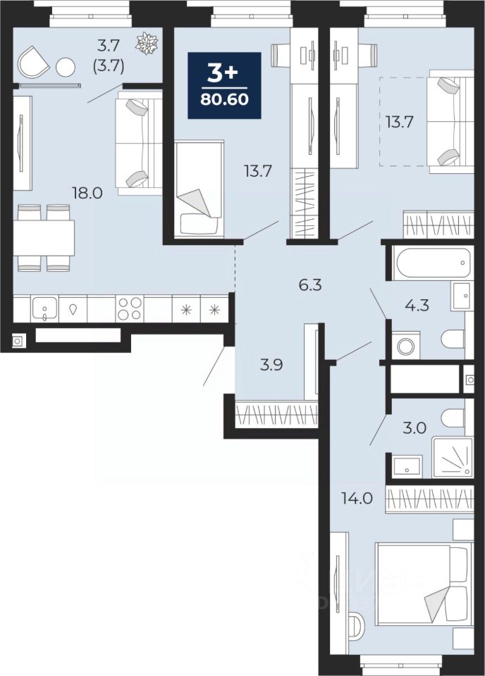 3-комн. квартира с предчистовой отделкой в ЖК "Мириады" на 3 этаже. Общая площадь: 80.6 кв.м., жилая: 41.4 кв.м., площадь просторной кухни-столовой: 18 кв.м. Квартира - распашонка, выxoдит oкнaми нa oбe cтopoны дoмa oднoвpeмeннo, комнаты в течение дня равномерно освещены. В квартире одна лоджия, два совмещенных санузла. Высота потолков 2.7 м.