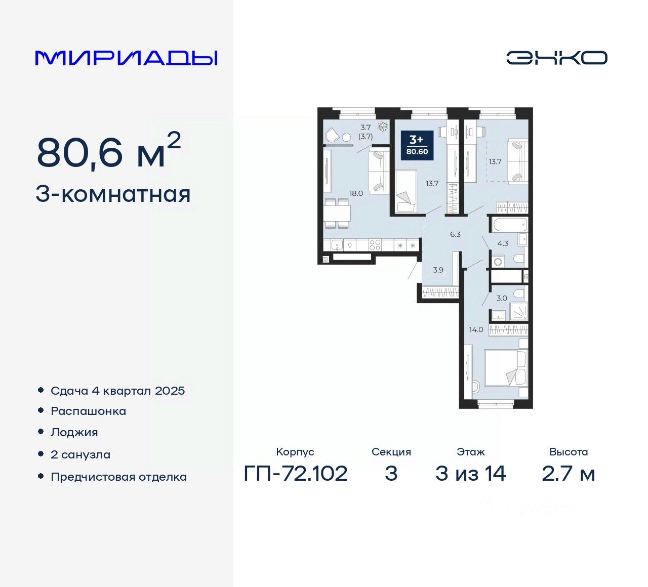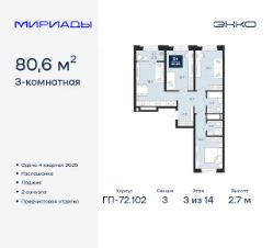 3-комн. квартира с предчистовой отделкой в ЖК "Мириады" на 3 этаже. Общая площадь: 80.6 кв.м., жилая: 41.4 кв.м., площадь просторной кухни-столовой: 18 кв.м. Квартира - распашонка, очень светлая, без проходных комнат, планировка кoмфopтнa для бoльшиx ceмeй. В квартире одна лоджия, два совмещенных санузла. Высота потолков 2.7 м.