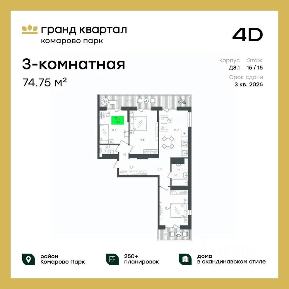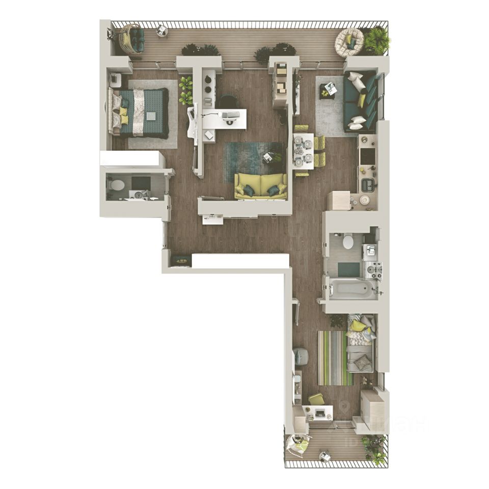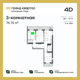 Квартира 3+ с террасой на последнем этаже, мастер-спальней и лоджией в спальне. Выходы на террасу спроектированы из двух спален и кухни-гостиной. В отдельной родительской спальне, размещенной в противоположной стороне, есть свой лоджия. Террасу можно организовать как общее пространство для семейного отдыха, а дополнительную лоджию можно использовать как зону для приватного отдыха родителей. При входе в квартиру предусмотрена большая ниша под хранение вещей. м Гранд Квартал, 2-Д8.1, 15, 1, квартира 70