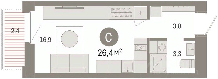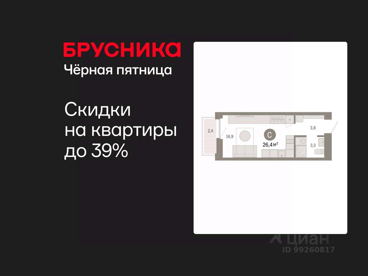 Студия в жилом районе "Зарека". Особенности планировки: предчистовая отделка, балкон.