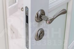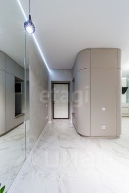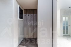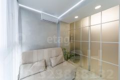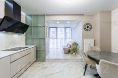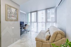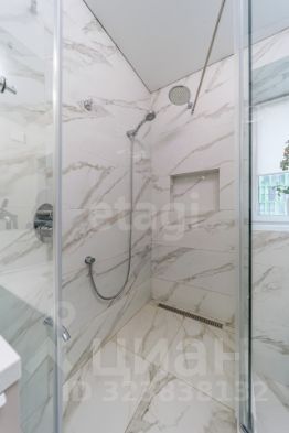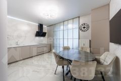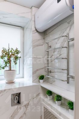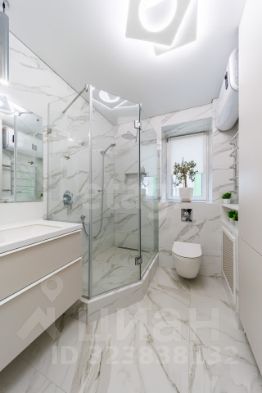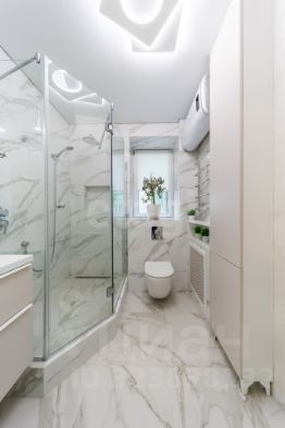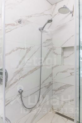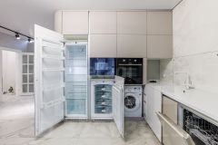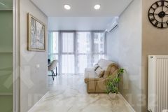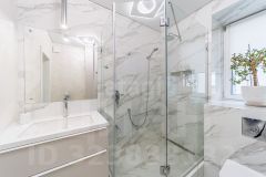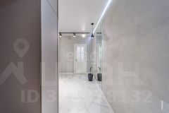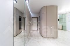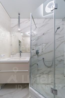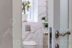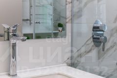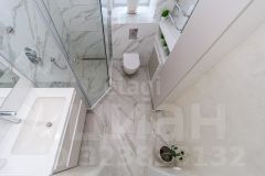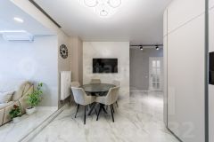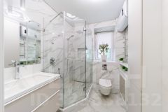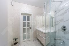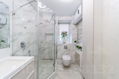 Сан. узел в дорогом кафеле соответствует общему дизайну квартиры. Большинство мебели для сохранения целостности и функциональности пространства сделана по индивидуальному заказу и идеально вписывается в размеры квартиры.