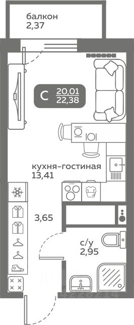 Прямая продажа от застройщика! Продается студия в строящемся ЖК "Меридиан Слобода", срок сдачи: I-кв. 2027, общей площадью 20.01 м², на 5 этаже из 20. Площадь кухни — 13.41 м².