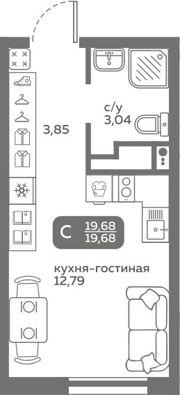 Прямая продажа от застройщика! Продается студия в строящемся ЖК "Меридиан Слобода", срок сдачи: I-кв. 2027, общей площадью 19.67 м², на 7 этаже из 20. Площадь кухни — 12.79 м².