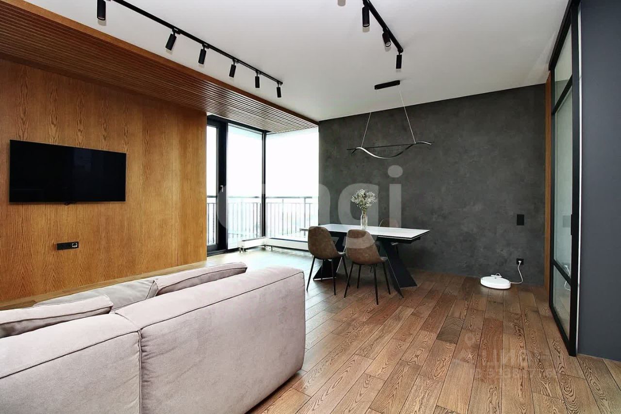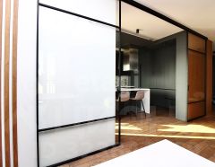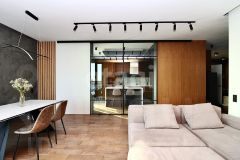 Далее везде напольное покрытие - инженерная доска, она придает квартире теплоту и уют. Скрытые двери добавляют эстетики и визуального порядка. Многоуровневая система освещения и проходные выключатели создают возможность создания различных световых сценариев в каждой комнате.