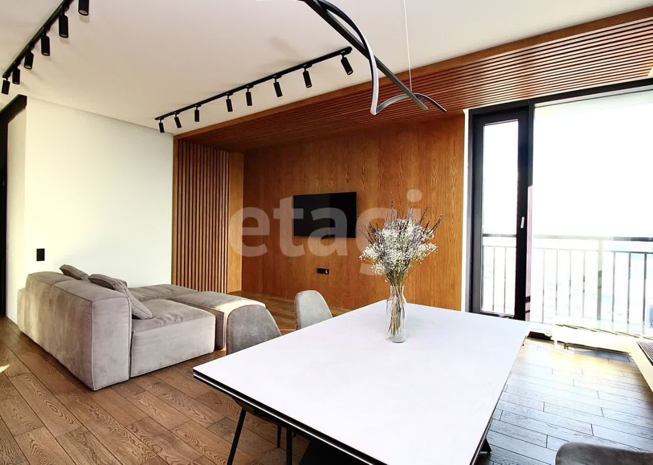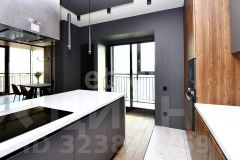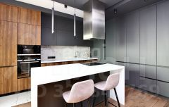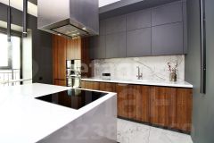 Кухня-гостиная - это идеальное место для приема гостей и семейных посиделок. Шикарное витражное угловое окно придает пространству особый шарм. Зоны кухни и гостиной разделены стеклянными раздвижными дверями, что создает ощущение простора и свободы. Кухня оснащена встроенным функциональным гарнитуром с техникой, а каменные столешницы добавляют роскоши и элегантности.