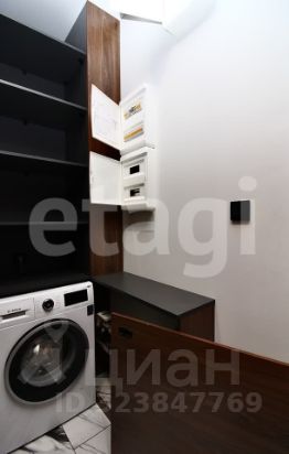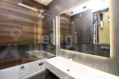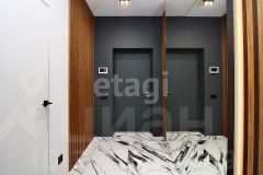 Ремонт выполнен по дизайн-проекту, единый стиль всех помещений придает квартире особую элегантность. В прихожей в качестве напольного покрытия выбран керамогранит, установлено большое зеркало с подсветкой. Здесь обустроена гардеробная, где достаточно места для хранения одежды и обуви, а также организована постирочная.