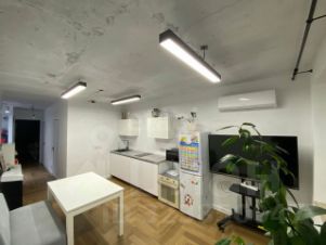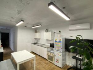 Кухня-гостиная поделена условно на две функциональные зоны: для приготовления пищи; для отдыха перед телевизором. Деление за счет расположения светильников и способа их включения (две клавиши- две зоны). В зоне отдыха, над телевизором расположен кондиционер. Его расположение и функциональные возможности позволяют в жару охлаждать не только кухню, но и всю квартиру.