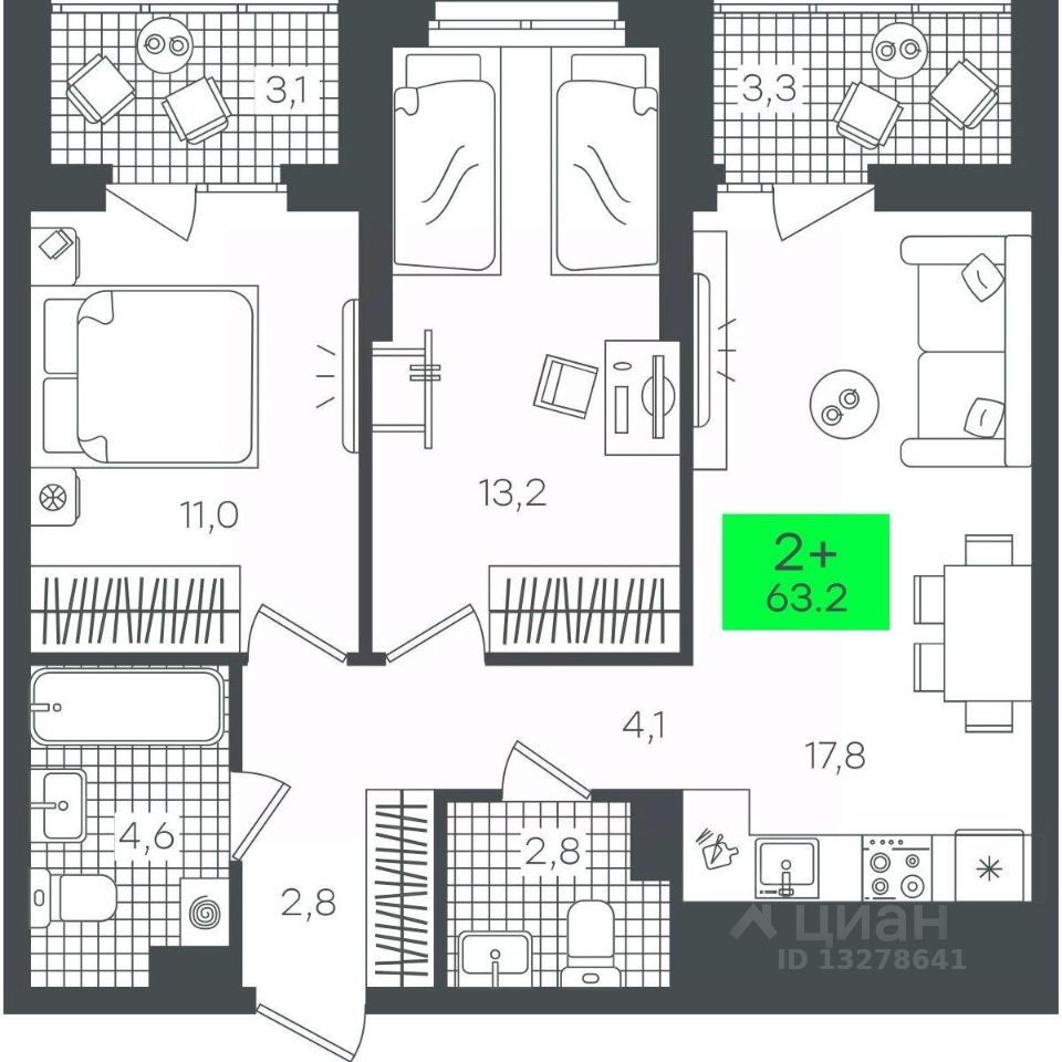 Продаётся 2-комнатная квартира в строящемся доме (В5.1 (Малкова, 19)), срок сдачи: III-кв. 2026, общей площадью 63.21 кв.м., на 13 этаже. Компания 4D приступила к строительству нового жилого комплекса "Гранд квартал". Новый ЖК находится в зеленой зоне Калининского района, южнее микрорайона Тюменская слобода.