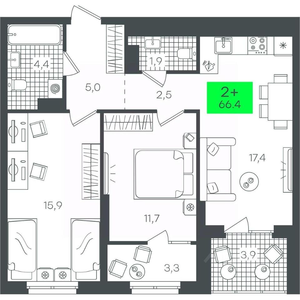 Продаётся 2-комнатная квартира в строящемся доме (3-В6.1 (Малкова, 15)), срок сдачи: III-кв. 2026, общей площадью 66.49 кв.м., на 14 этаже. Компания 4D приступила к строительству нового жилого комплекса "Гранд квартал". Новый ЖК находится в зеленой зоне Калининского района, южнее микрорайона Тюменская слобода.