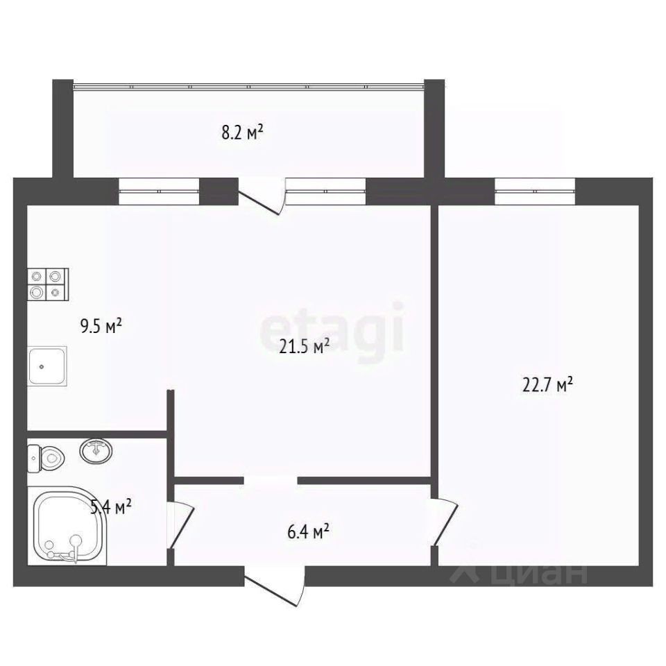 Квартира имеет классическую планировку: стандартная кухня - 9,5 кв.м., большая гостиная - 21,5 кв.м. и спальня - 22,7 кв.м.