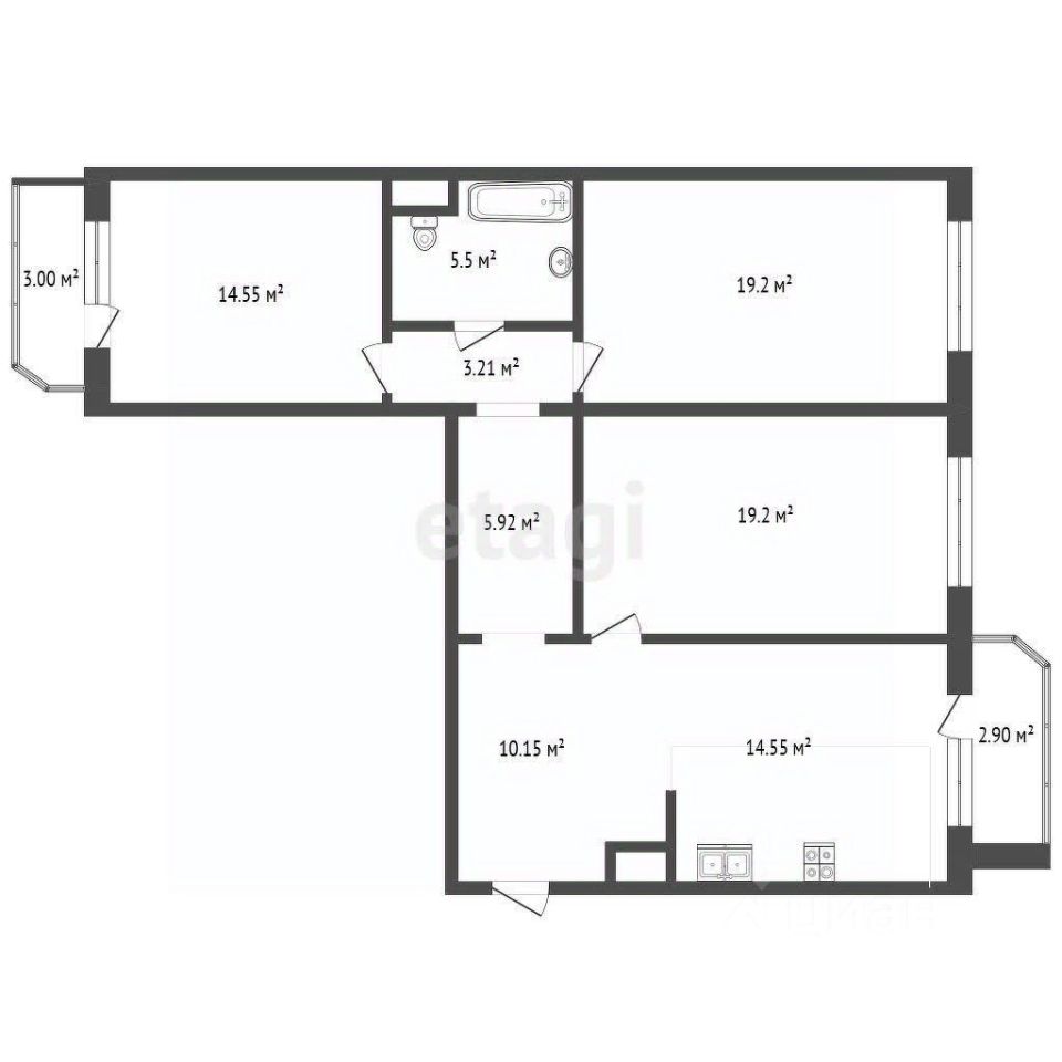 Просторная кухня-гостиная 14.55 кв.м., 3 изолированные комнаты 19,2м2; 19,2м2; 14.55м2. Окна выходят на обе стороны дома.