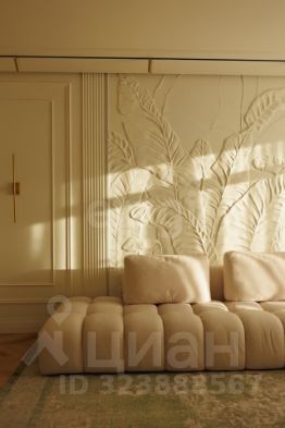 Стены, идеально ровные и окрашенные в моющуюся краску премиум-класса, украшены изящными декоративными молдингами, создающими игру света и тени. Центральным арт-объектом гостиной зоны выступает масштабный барельеф ручной работы — уникальное произведение искусства, задающее статус всему помещению.