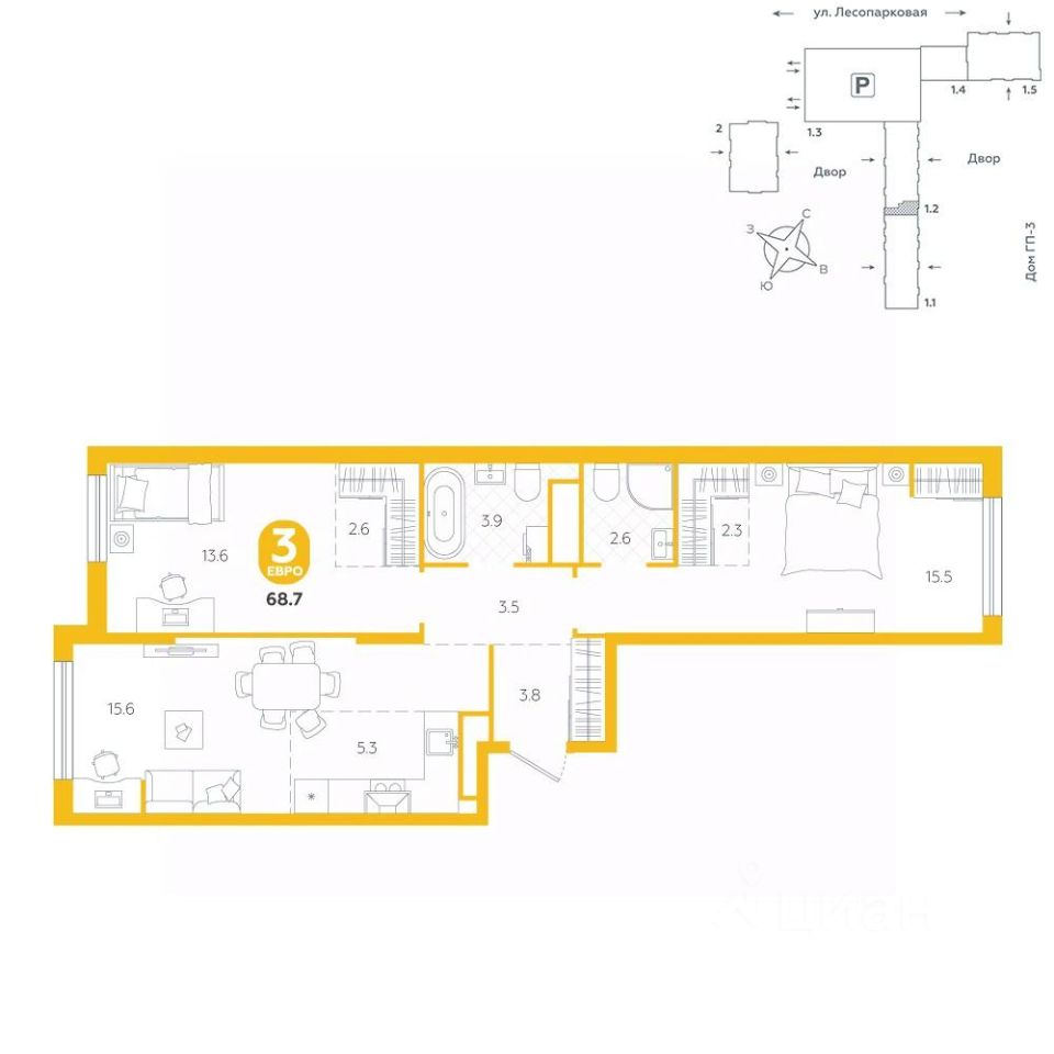 площадь квартиры - 68,7 кв.мГармоничные пропорции и большие окна наполняют пространство светом, создавая уютную атмосферу. Умное зонирование позволяет удобно организовать как рабочую, так и жилую зоны, что особенно важно для современных жителей. Санузел спроектирован с учетом всех потребностей: здесь есть ванна и место для стиральной машины. Каждый метр квартиры используется с максимальной эффективностью, что делает эту планировку отличным выбором для тех, кто ценит комфорт и удобство.