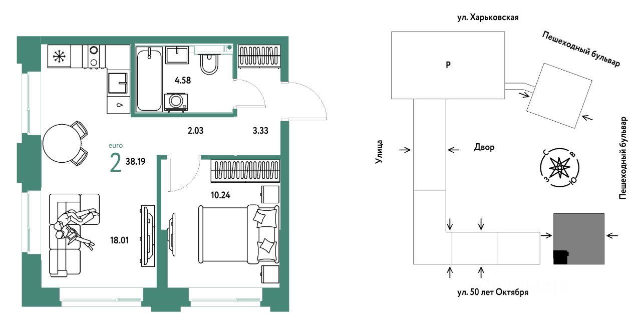 Продается 2комнатная квартира на 4 этаже от застройщика Страна Девелопмент. Площадь квартиры 38,19 кв. м.