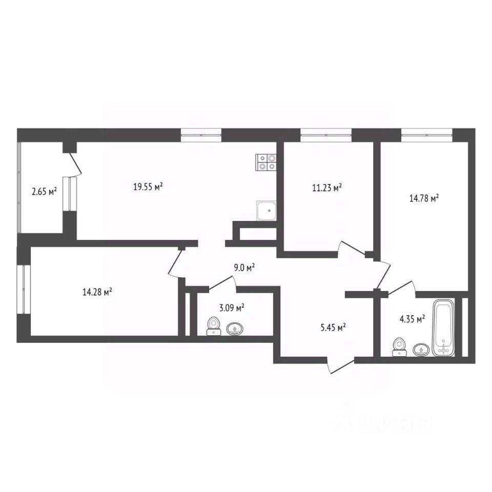 • Современная планировка: Просторная кухня-гостиная 19,55 кв.м., два санузла и мастер-спальня.