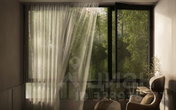 Студия с лоджией. Она с панорамным остеклением в пол. Там же выход в урбан-сад: летом можете поставить снаружи садовую мебель и выходить в урбан-сад, чтобы почитать книгу. Зимой — выпить горячий шоколад в пледе на свежем воздухе. Кухню можете разместить в нише и отгородить спальное место перегородками.