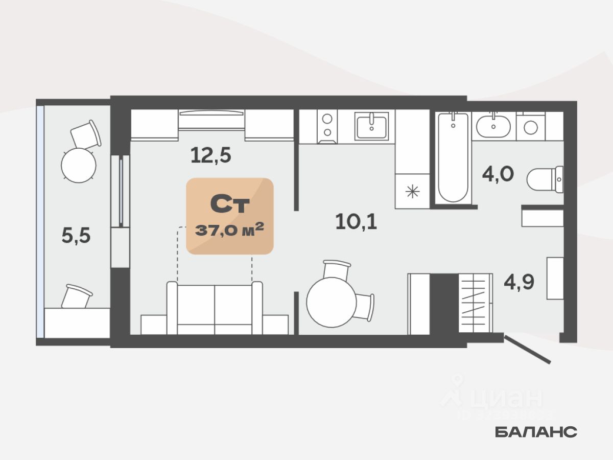 Просторная студия с перегородками, которые разделяют пространство квартиры на две комнаты. В одной из них выход на лоджию с панорамным остеклением— будет больше света. В другой комнате кухня. Вещи можете хранить в холле: здесь есть место для шкафа, комода и обувницы.