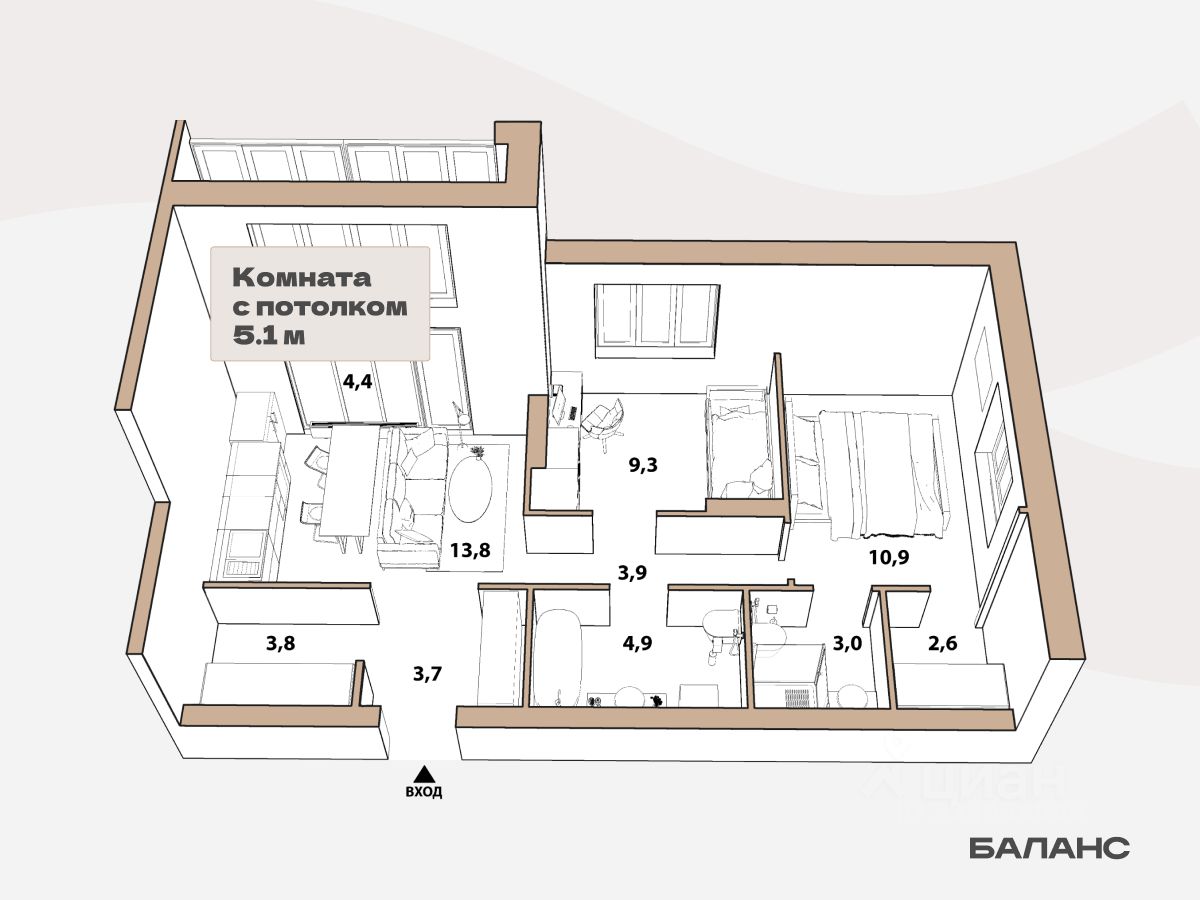 Квртира в формате хайфлэт — одна из комнат с высоким потолком 5,1 метров. Внутри мастер-спальни продуманы отдельный санузел и гардеробная. Вторая гардеробная в прихожей. Выход на лоджию с панорамным остеклением в кухне-гостиной расширит пространство.