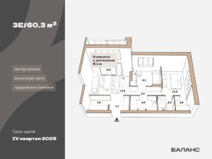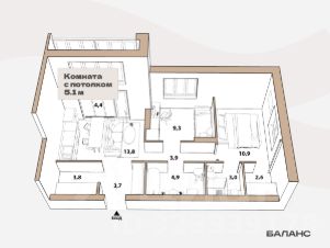 Квртира в формате хайфлэт — одна из комнат с высоким потолком 5,1 метров. Внутри мастер-спальни продуманы отдельный санузел и гардеробная. Вторая гардеробная в прихожей. Выход на лоджию с панорамным остеклением в кухне-гостиной расширит пространство.