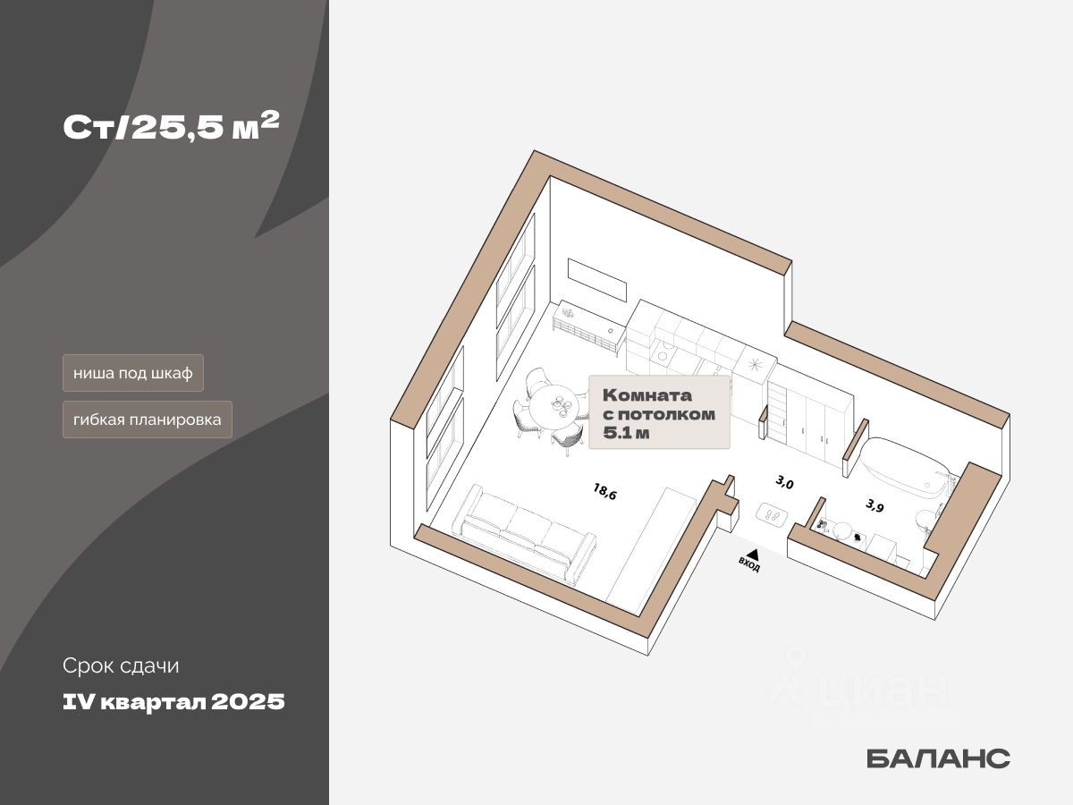 В квартире экстравысокие потолки 5,1 метров — это хайфлэт на 23 этаже. Остекление в два ряда — из первого открывается вид на город, второй впускает больше света. Для хранение вещей в прихожей ниша под шкаф.