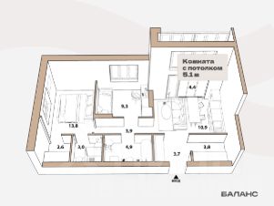 Квртира в формате хайфлэт — одна из комнат с высоким потолком 5,1 метров. Внутри мастер-спальни продуманы отдельный санузел и гардеробная. Вторая гардеробная в прихожей. Выход на лоджию с панорамным остеклением в кухне-гостиной расширит пространство.