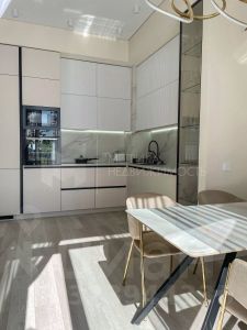 Удобный диван в гостиной(можно сделать угловым), ТВ-зона с подсветкой и местами хранения, кровать 160х200, диван в детской, встроенный шкаф. Большой встроенный кухонный гарнитур с качественной фурнитурой, посудомоечная машина на 60 см (фирмы Воsсh), встроенный холодильник Наiеr, встроенная СВЧ и духовой шкаф, индукционная варочная панель. Обеденный стол из керамогранита 160х80х75 выполненный на заказ.