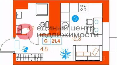- Общая площадь составляет 21,4 кв.м., что позволяет разместиться с комфортом.