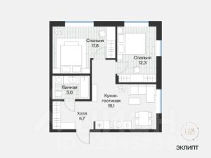 Квартира с окнами на две стороны и двумя спальнями. Планировка условно поделена на приватную и общую часть. Для времени вместе — кухня-гостиная. Хранение вещей можете организовать в холле — там просторно и есть ниша под шкаф-купе.