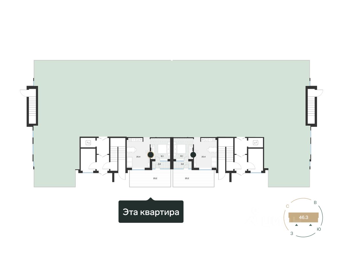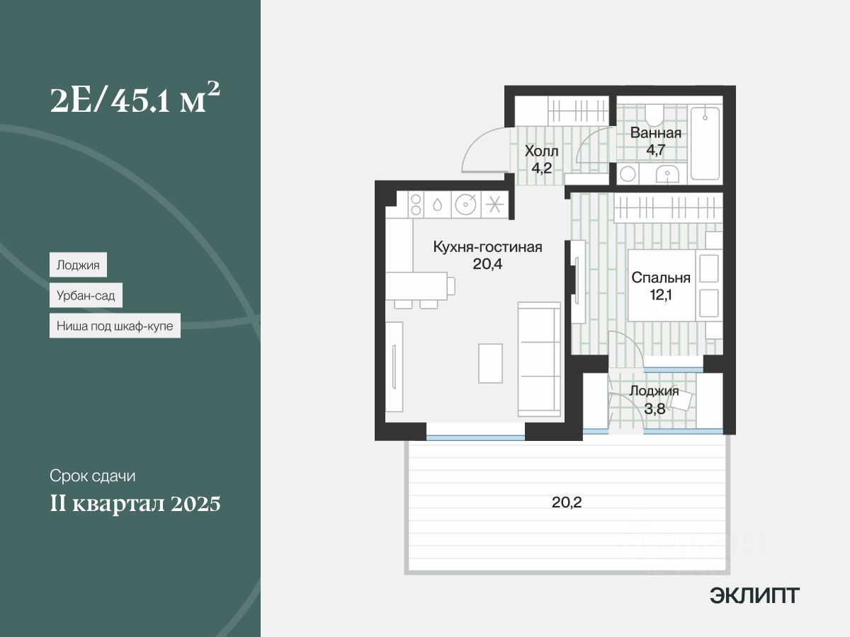 Квартира с урбан-садом. Это прилегающий к дому участок, где летом можно поставить плетёную мебель и выходить, чтобы почитать книгу. Зимой — выпить горячий шоколад на свежем воздухе. Выход в урбан-сад через лоджию в спальне.