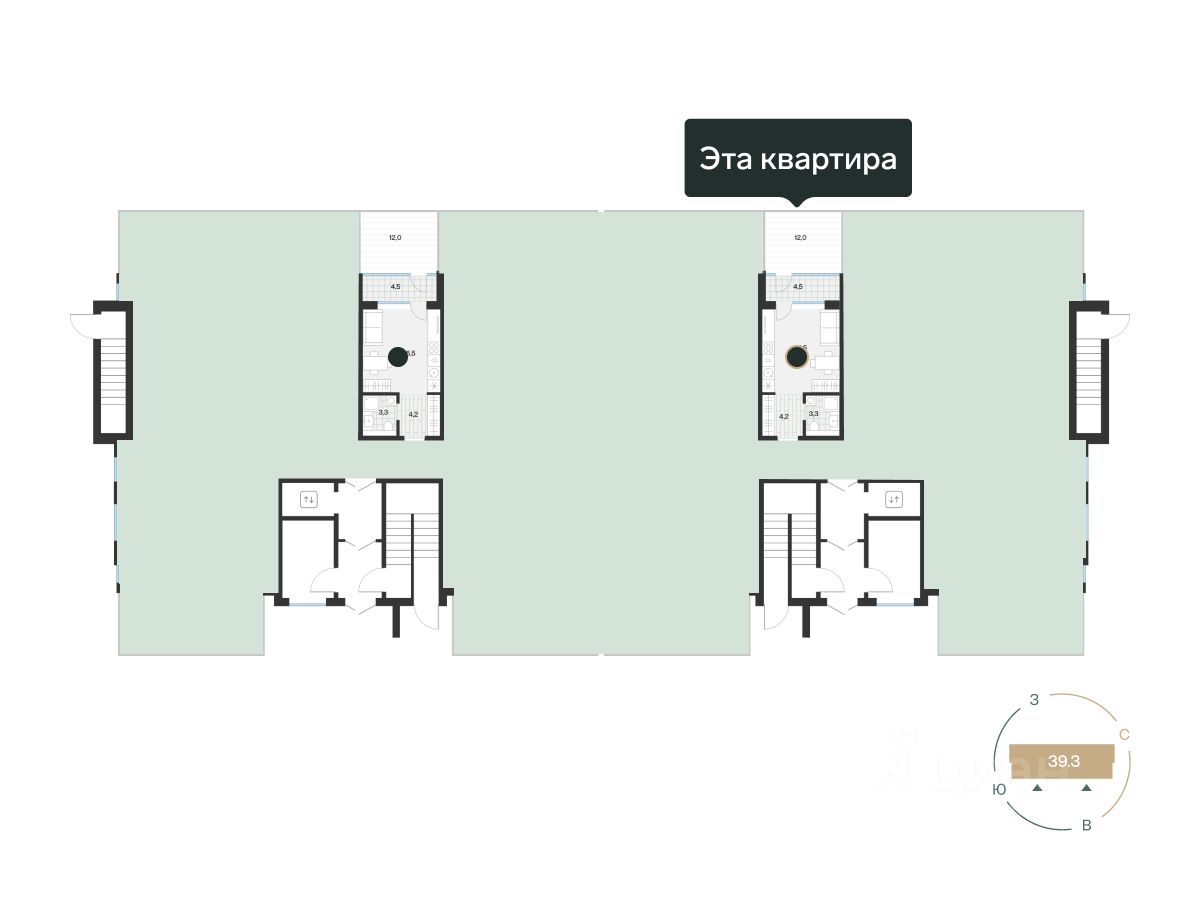 Студия с лоджией. Она с панорамным остеклением в пол. Там же выход в урбан-сад: летом можете поставить снаружи садовую мебель и выходить в урбан-сад, чтобы почитать книгу. Зимой — выпить горячий шоколад в пледе на свежем воздухе. Кухню можете разместить в нише и отгородить спальное место перегородками.