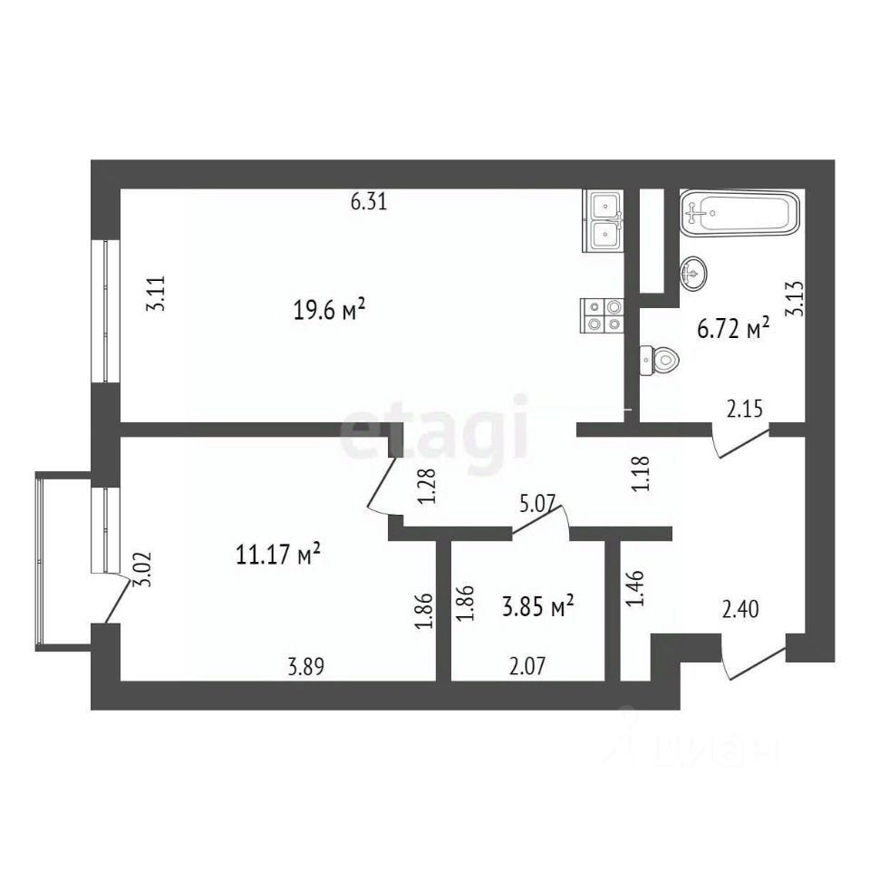 Планировка мечты: просторная кухня-гостиная для вечеров с близкими, уютная спальня и отдельная вместительная гардеробная.