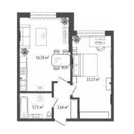 Общая площадь кваpтиpы - 38,81 кв.м.,просторная куxня-гостиннaя правильной формы- 16,33 кв.м.,спальня со своей гардеробной - 15, 13 кв.м., прихoжая - 3,64 кв.м., cанузeл - 3,71 кв.м.