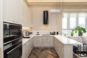 По мебели остается: кухонный гарнитур, встроенные шкафы, духовой шкаф, микроволновка, плита, посудомоечная, вытяжка, кондиционер, водонагреватель, диван, стулья.