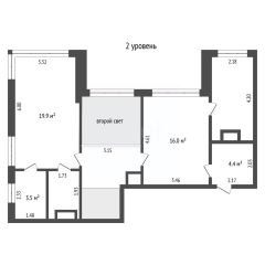Продуманная планировка с разнесением гостевой и приватных зон: кухня-гостиная 42.5 м2 с вторым светом и выходом на просторную террасу , откуда открывается вид на ВЕСЬ ГОРОД, на три стороны света. На первом этаже расположена спальня 19,41 м2, на втором - 2 мастер -спальни по 19,41м2 , и 15,9 м2.