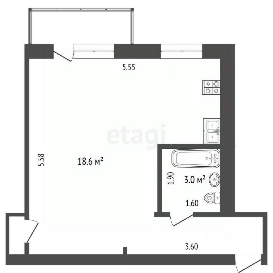 Балкон с металлической решеткой ждет своего оформления. Окна выходят на территорию детского сада, обеспечивая тишину и спокойный вид. В шаговой доступности находится благоустроенный парк с фонтаном и детскими площадками.