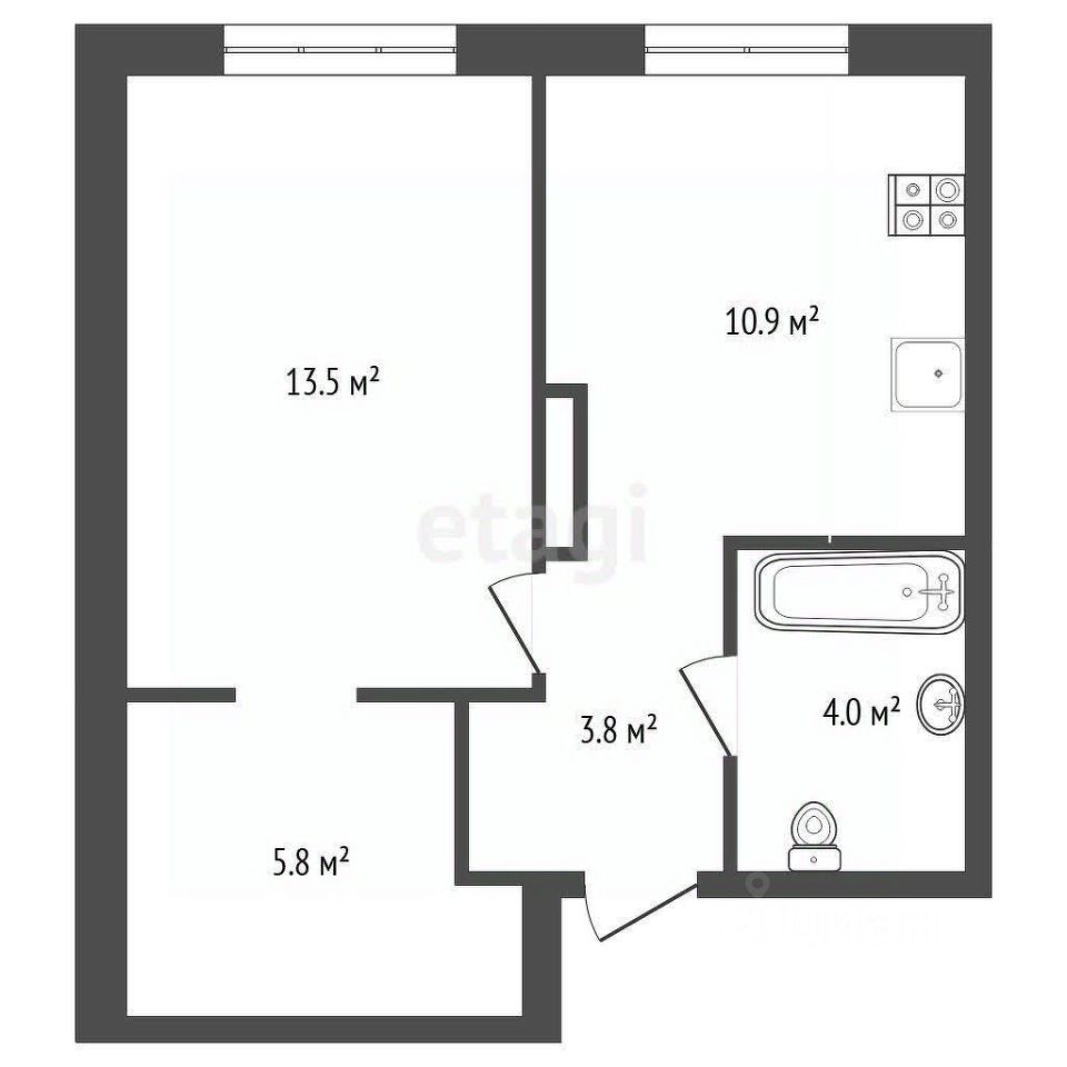 Удобная планировка с выделенной гардеробной 5,8 кв.м.,комната- 13,5 кв.м. кухня- 10.9 кв.м. сан.узел-4,2 кв.м. прихожая -3.8 кв.м.