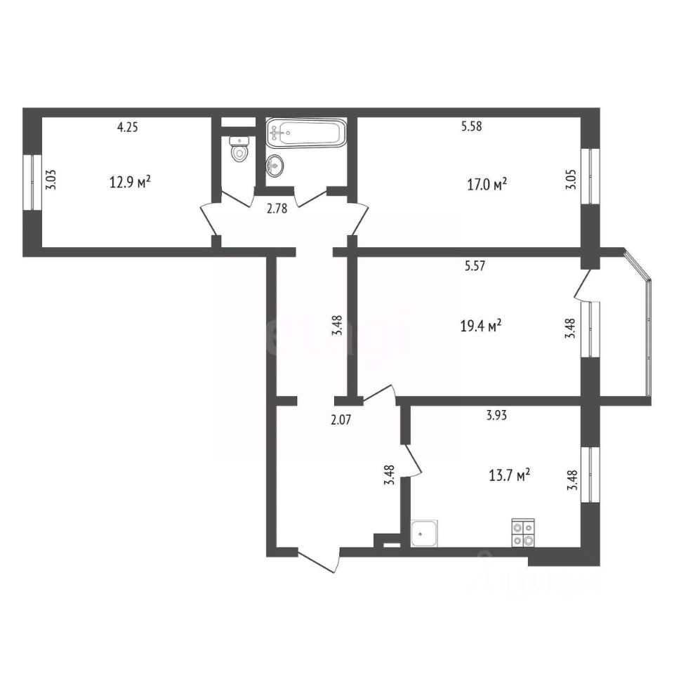 Три изолированных комнаты площадью 19.4 м2, 17 м2 и 12,9 м2.