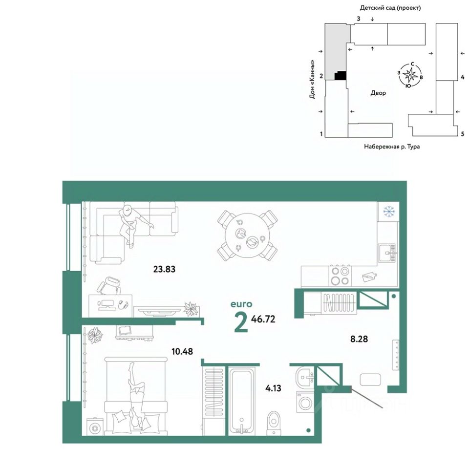 Продается 2комнатная квартира в новом ЖК "Европейский берег". Общая площадь квартиры 46,72 кв. м. Сдача — в 4 квартале 2025 года.