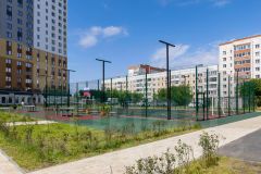 ЖК состоит из трех современных домов переменной этажности (1423 этажа), объединенных благоустроенной территорией. Двор закрыт для машин, оборудован системой видеонаблюдения и разделен на зоны для отдыха: детские площадки с безопасным покрытием, спортивные площадки для мини-футбола и баскетбола, воркаут-зону с тренажерами. Пешеходные и велосипедные дорожки ведут к озеру, создавая условия для прогулок. Подъезды оформлены в едином стиле, оснащены прозрачными входными группами и двумя бесшумными скоростными лифтами. Удобные сквозные проходы связывают улицу и двор, сокращая путь к транспорту.