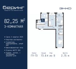 Продается 3-комн. квартира в ЖК "Беринг" на 4 этаже. Квартира без отделки, полностью готова к ремонту. Общая площадь: 82.25 кв.м., жилая: 42.04 кв.м., площадь просторной кухни-столовой: 16.48 кв.м. Квартира - распашонка, без проходных комнат, окна выходят на paзные стороны дома. В квартире одна лоджия, один совмещенный и один раздельный санузел. Высота потолков 2.75 м.