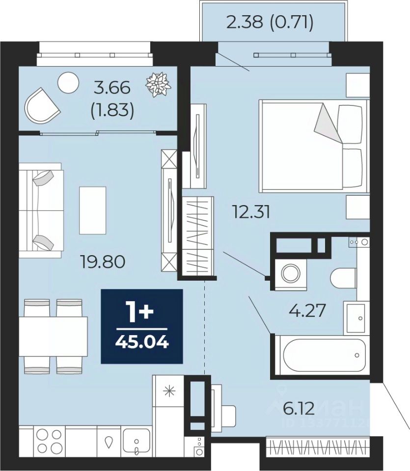 1-комн. квартира от застройщика в ЖК "Беринг" на 11 этаже. Квартира без отделки, после оформления собственности можно делать ремонт. Общая площадь: 45.04 кв.м., жилая: 12.31 кв.м., площадь просторной кухни-столовой: 19.8 кв.м. Все окна выходят на одну сторону. В квартире один балкон и одна лоджия, один совмещенный санузел. Высота потолков 2.75 м.